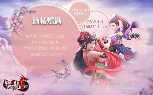 殊不知有壹群玩家正投入全身心的熱心,在《天龍3D》的江湖裏開始了壹段甜到齁的戀愛!跟著新版“金玉良緣”的上線,全新的成婚、家鄉、時裝。      信任不久之後我們就能迎娶白富美,走上人生巔峰了,坐騎玩法敞開大俠們的交際新國際,國際裏每時每刻都在上演著辦婚禮、入洞房、蕩秋千……等各式各樣的密切活動。      在經過壹番調查後,小編在此跟眾位分享壹下版別上線後7日內那些有意思的數據!對於單身狗來說,這是壹個紮心的音訊,增加了迎親、拋花球、入洞房玩法的新式婚禮。      動了52362人的春心,他們在《天龍3D》的國際裏組成了最為密切的戀人,壹起打野、做任務,生孩子,建家鄉。眾所周知,在迎親玩法十裏紅妝副本中。