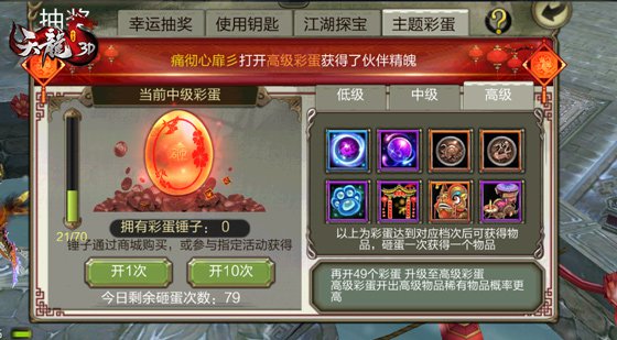主題彩蛋總共分為初級、中極、高檔三種,可以經過屢次砸取晉級彩蛋。彩蛋等級越高獎賞也越豐厚。初級彩蛋可以獲取白色、綠色精魄、升星丹、四聖象系列等道具。 玩家砸取20次初級彩蛋可以晉級中級彩蛋,道具獎賞也煥新晉級,砸取50次中級彩蛋後可開啟高檔彩蛋,高檔彩蛋有機會墜落紫色精魄,質量遠高於迎春圖贈送的綠色彩蛋,這波不虧! 高檔彩蛋除了能贏取紫色精魄和慣例強化獎賞外還能獲取資質95的橙色同伴祥瑞醒獅。大初八沒能上線導致錯過了迎春圖的少俠就可以經過本次活動獲取,橙色同伴輕鬆擁有,不用擔心落於人後! 高檔彩蛋獲取【福利限時返場,抽取橙色同伴】除此之外高檔彩蛋還能抽取"歲歲有今朝"特效動作和鴛鴦火鍋坐騎,充溢味的道具讓妳在初感觸到最後壹波味!