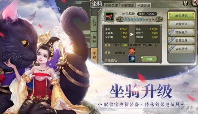 玩家能够通过商城或其他方式取得坐骑配备——赤兔马凯、精刚兽爪、驭兽宝典、火焰蹄铁、冰霜铠甲,不同的坐骑配备具有不同的功用,可添加防御、生命。