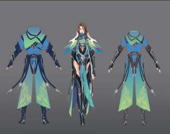天山高檔時裝極具規劃感,漆黑是刺客最好的夥伴,玄青色的戰甲與緊束修身的裁剪帶來極強的壓迫感。雙肩靈鷲印記散發著金屬的寒意,靈鷲雙翅光彩流動,整體調配顯著與中原門派不同,更富有異域風情。 身後飾帶末端皆配有利器,仿佛夜色中的一寸流星,冷艷而又危險。下擺處相同以暗紋繡製靈鷲徽記,這是敵人倒下後才能察覺到的冷漠,也是童姥縱橫西域的赫赫威名。